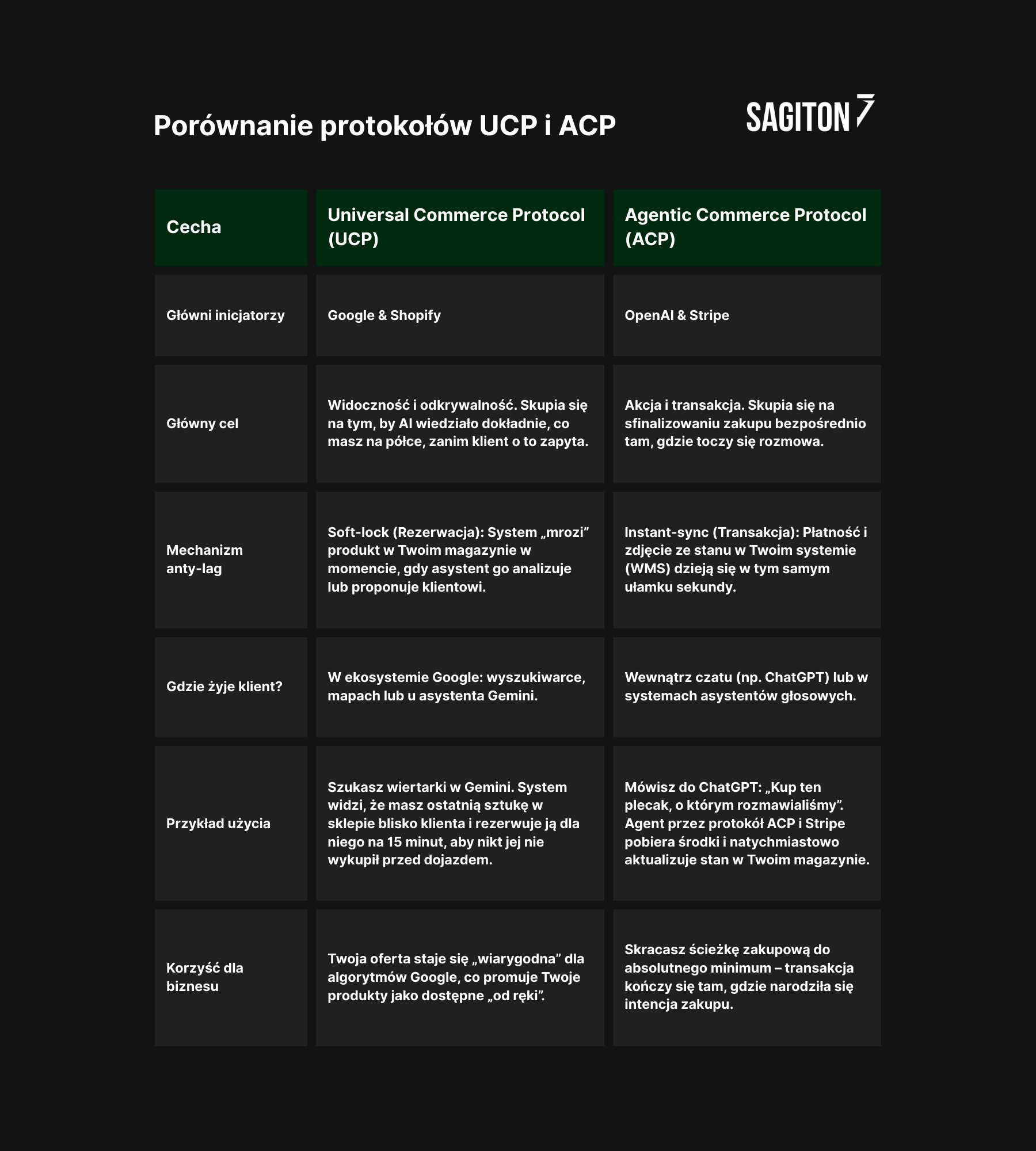 Jak to walczy z lagiem? W ACP to procesor transakcji (Stripe) staje się głównym arbitrem. Kiedy ChatGPT mówi „kupuję”, protokół ACP wykonuje uderzenie do Twojego systemu, które łączy dwa kroki w jeden: autoryzację płatności z natychmiastowym zdjęciem stanu. Jeśli Twój system nie potwierdzi rezerwacji towaru w ułamku sekundy, Stripe nie pobierze pieniędzy. Dzięki temu unikasz sytuacji, w której masz pieniądze, ale nie masz co wysłać. To protokół akcji i rozliczeń.